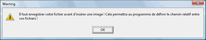 • Il faut avoir enregistré le fichier Hot Potatoes avant d'insérer une image. Dans le cas contraire, l'insérer est impossible et l'avertissement suivant s'affiche :